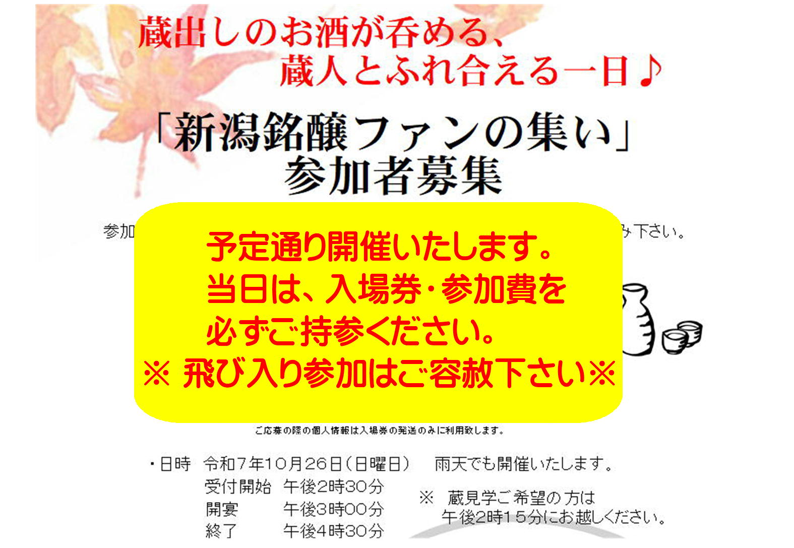 先般、参加者を募集いたしました「新潟銘醸ファンの集い」を予定通り、10月26日(日)に開催します。