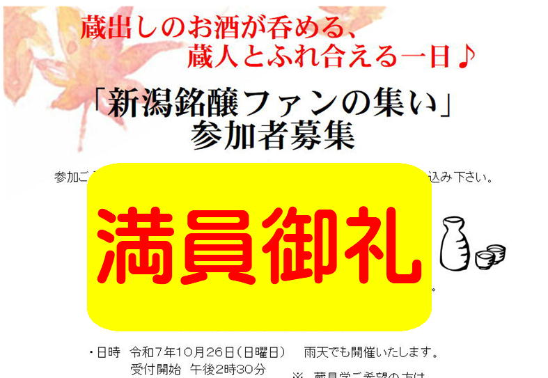 「新潟銘醸ファンの集い」のお申込受付が定員に達しましたので、応募〆切前ではございますが、