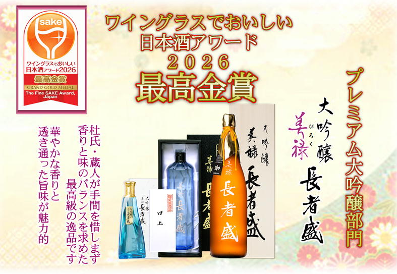 「美禄 長者盛 大吟醸」 がプレミアム大吟醸部門≪最高金賞≫を受賞いたしました。